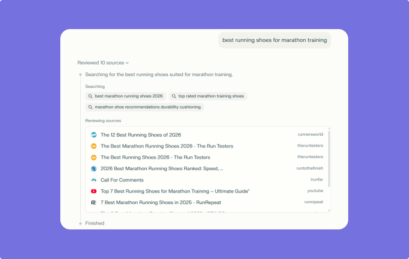 For example, if someone searches for "best running shoes for marathon training," an AI model using query fan-out might simultaneously generate sub-queries like "top-rated marathon running shoes in 2026," "running shoes with the best durability for high mileage," "cushioned vs. responsive running shoes for marathons," and "price comparison of top marathon shoes". The system then retrieves answers for all these sub-questions and synthesizes them into a single cohesive response.